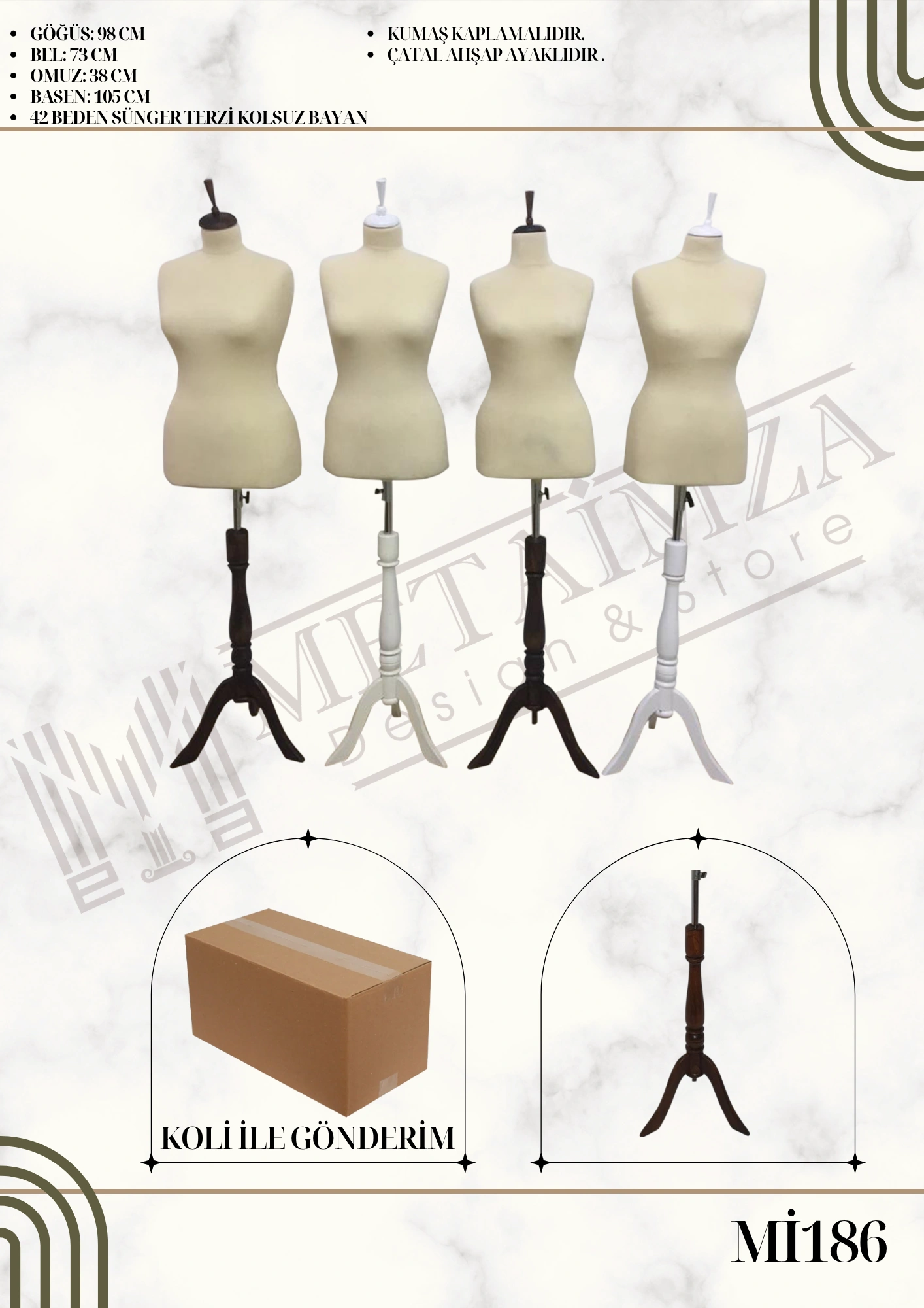 Kumaş kaplamalıdır, çatal ahşap ayaklıdır.